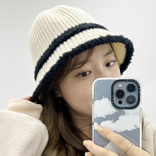 配色 ボア ライン ニット バケット ハット 女性 レディース 帽子 ビーニー バケツ 秋 冬 防寒 保温 単色 無地 もこもこ ふわふわ セーター ソフト シンプル ミニマル レディ 女優 エレガン