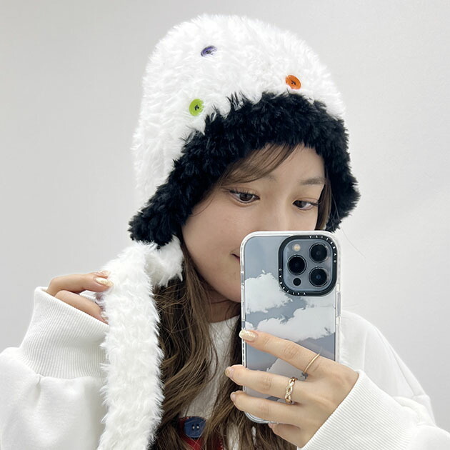 カラフル ボタン 配色 ファー ニット キャップ 女性 レディース 帽子 ハット ビーニー 秋 冬 防寒 保温 バイカラー カラフル ポップ ボア ソフト シンプル カジュアル イヤーマフ あったか