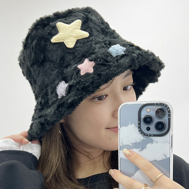 カラフル スター ワッペン付き ファー バケット ハット 女性 レディース 帽子 キャップ 秋 冬 バケツ バケハ 防寒 保温 ソフト あったか ボア 単色 無地 カジュアル ストリート ふわふわ ウ