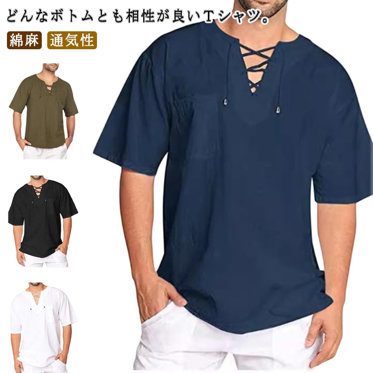 半袖 ヘンリーネック 綿麻シャツ メンズ Tシャツ 無地Tシャツ トップス ワイシャツメンズファッション トップス Tシャツ カットソー