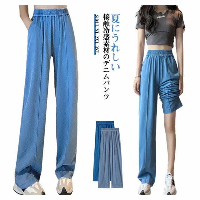冷感素材 冷感素材 レディース デニムパンツ UVカット デニム 接触冷感 冷感 ボトムス ひんやり 薄手 ワイドパンツ