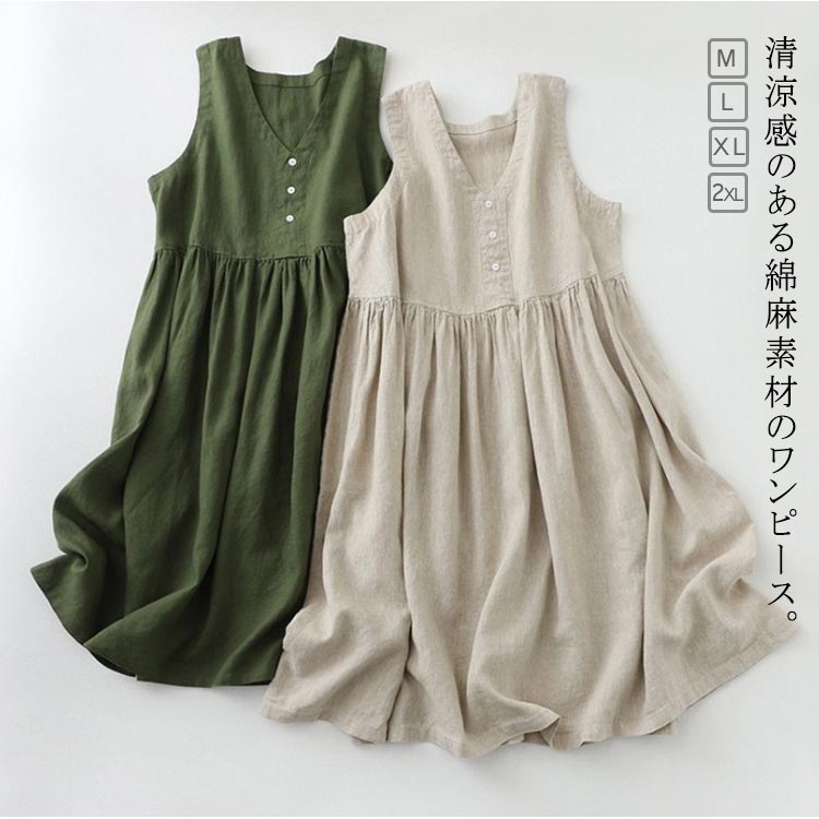 リネン ノースリーブワンピース ウエスト切り替え らくちん 涼しい 大きいサイズ 清涼感レディースファッション ワンピース