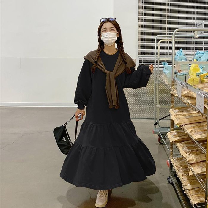 ワンピース レディース ティアードワンピース スウェットワンピ 秋 春 冬 スウェット クルーネック 長袖 ギャザー 無地 オーバーサイズ Aライン マキシ丈 シンプル 楽ちん ラフ フレア