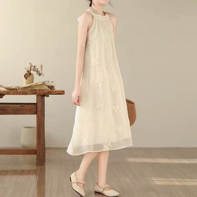 ワンピース レディース フレア ロング 袖なし ノースリーブ オープンショルダー Uネック ラウンドネック Aライン オーバーサイズ フェミニン 刺繍 かわいい 大人可愛い きれいめ