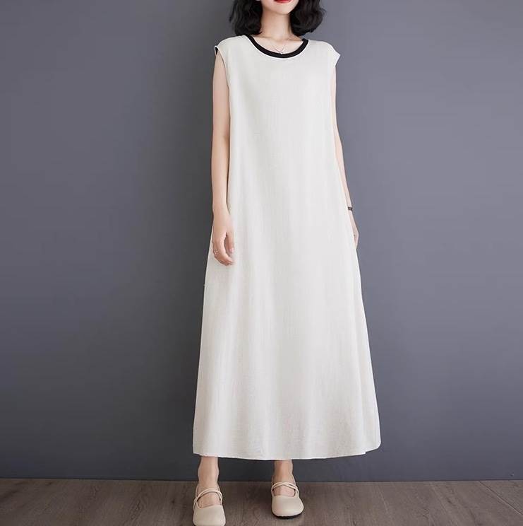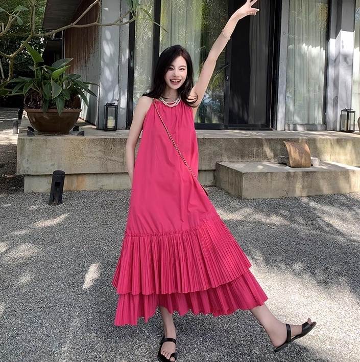 ワンピース レディース フレア マキシ 袖なし ノースリーブ ラウンドネック ライン オーバーサイズ フェミニン ストリート スリット バックスリット バックコンシャス ボタン