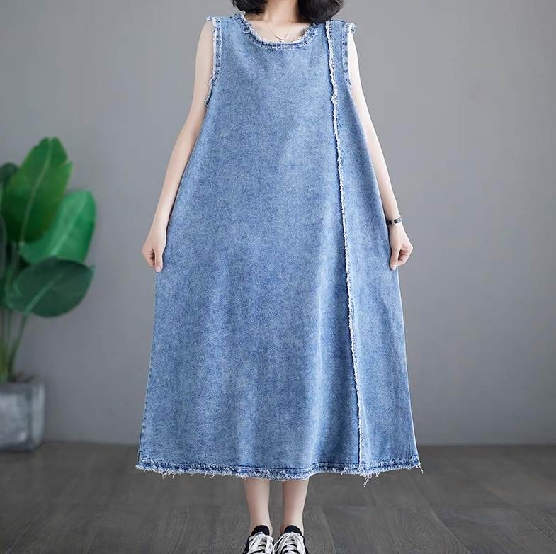 ワンピース レディース フレア マキシ アシンメトリー 袖なし ノースリーブ ラウンドネック Aライン フェミニン ストリート リボン バックリボン デニム ブルーデニム かわいい