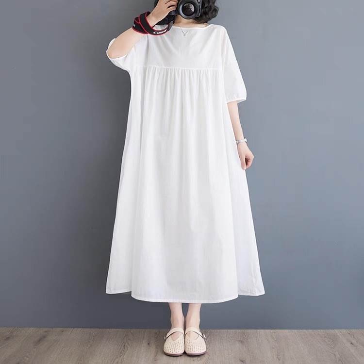 ワンピース レディース フレア マキシ 5分袖 ラウンドネック ライン オーバーサイズ フェミニン ウエストマーク ハイウエスト 大人可愛い きれいめ シンプル カジュアル おしゃれ