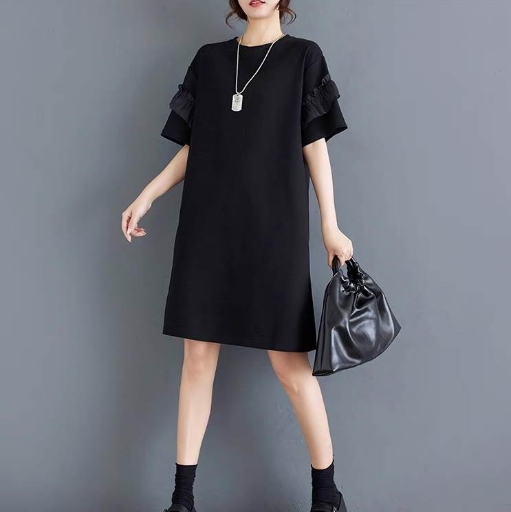 ワンピース レディース フレア 膝丈 5分袖 フリル袖 ラウンドネック ライン オーバーサイズ フェミニン かわいい 大人可愛い きれいめ シンプル カジュアル おしゃれ こなれ感 ガーリー