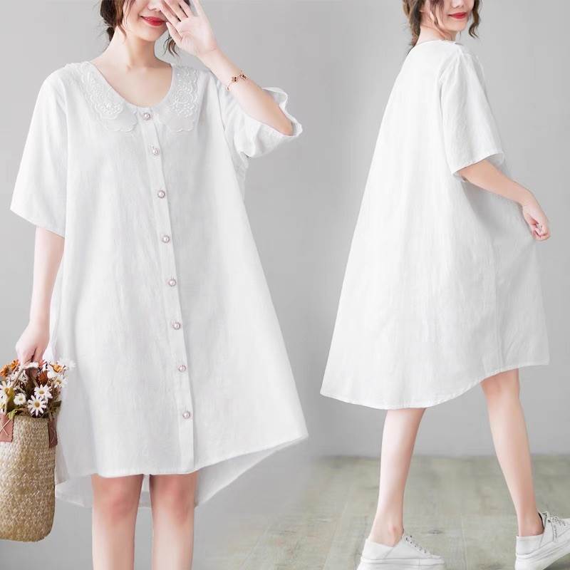 ワンピース レディース シャツワンピ フレア 前開き 膝丈 5分袖 襟付き 丸襟 フェミニン 刺繍 フリル ふっくら ボタン かわいい 大人可愛い きれいめ シンプル おしゃれ ガーリー