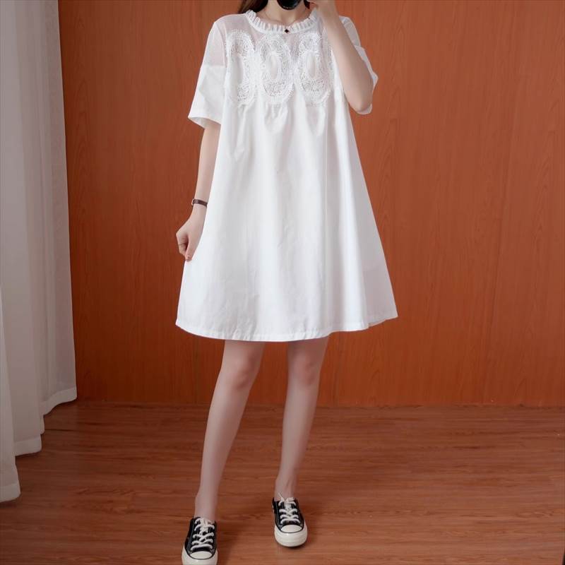 ワンピース レディース フレア 膝丈 膝上 半袖 5分袖 ラウンドネック 切り替え ドッキング フェミニン レース 刺繍 フリル かわいい 大人可愛い きれいめ シンプル カジュアル おしゃれ