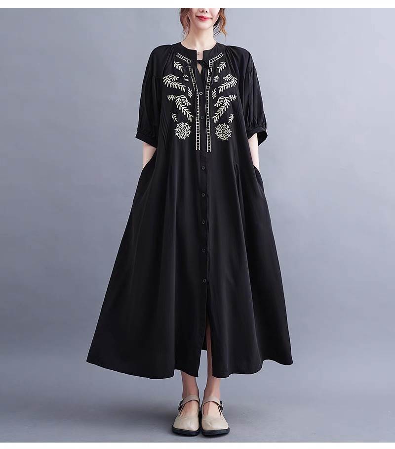 ワンピース レディース シャツワンピ フレア 前開き ロング 半袖 5分袖 ラウンドネック ライン フェミニン ストリート 刺繍 リボン ウエストマーク ポケット ハイウエスト 異国風