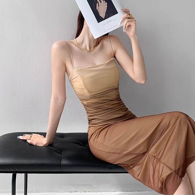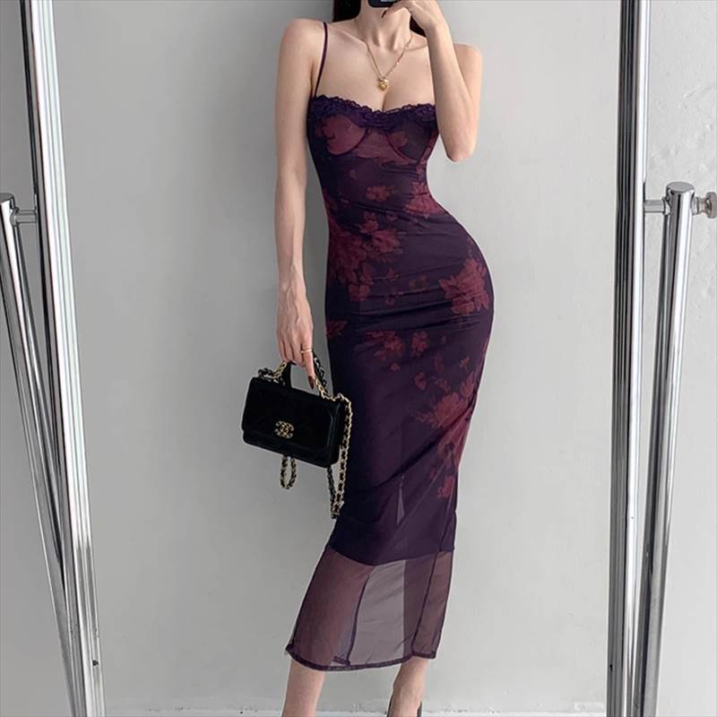 ワンピース レディース ロング マキシ 袖なし ノースリーブ タイト スリム 細身 Iライン 背中開き フェミニン レース ハイウエスト 編み上げ レースアップ 透け感 シースルー セクシー