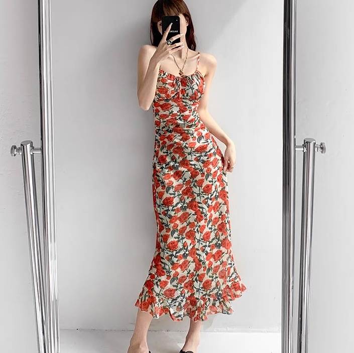 ワンピース レディース ロング マキシ 袖なし ノースリーブ タイト スリム 細身 フェミニン フリル リボン ギャザー かわいい 大人可愛い おしゃれ レトロ こなれ感 ガーリー エレガント