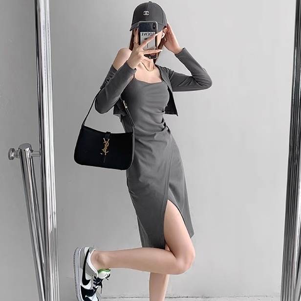 2点セット トップス ワンピース カーディガン レディース 羽織 前開き 膝丈 アシンメトリー 袖なし ノースリーブ 長袖 タイト スリム 細身 スマート フェミニン ストリート スリット