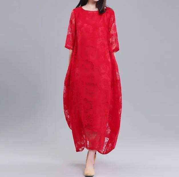 ワンピース レディース ロング 5分袖 7分袖 ラウンドネック オーバーサイズ バルーン フェミニン レース ふっくら かわいい 大人可愛い きれいめ シンプル カジュアル おしゃれ レトロ