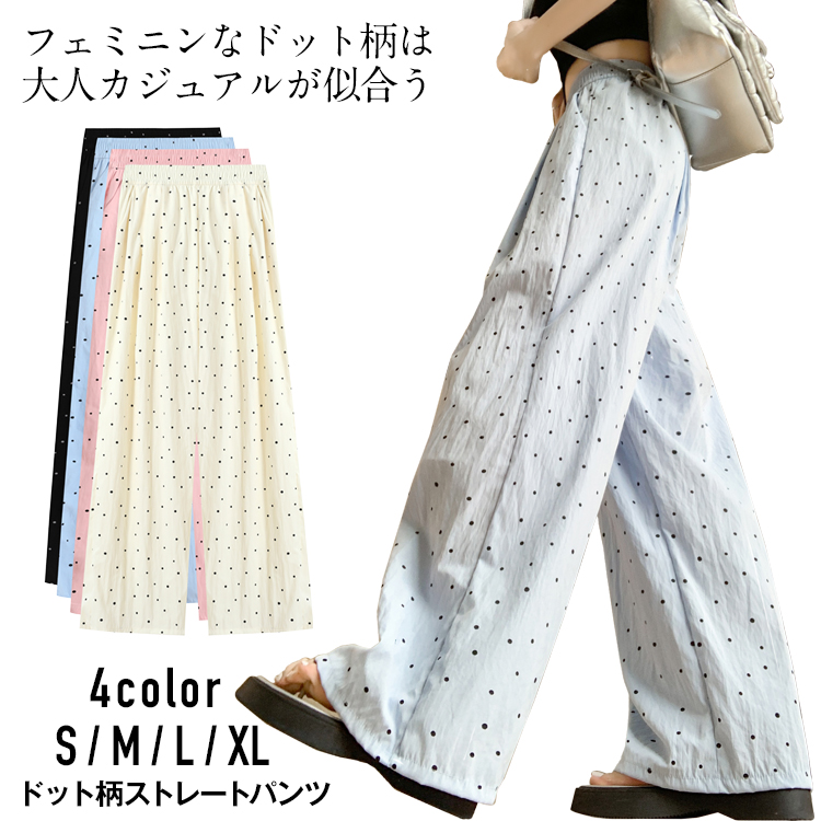 春夏 レディース パンツ ドット柄 ストレートパンツ レディース リラックス パンツ 水玉 小さめドット ストレートパンツ さらさら リラックスパンツ ポケットつき ウエストゴム