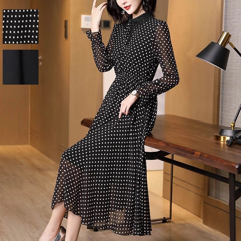 ドット柄ワンピース 水玉 無地 シフォンワンピース シフォン ワンピース ボウタイワンピース ドレス ロングワンピース マキシワンピース エンパイアワンピース Aライン シアー 透け 長袖 夏 秋 春