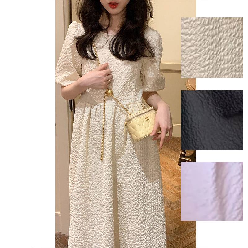 ワンピース ボリューム袖 ワンピース レディース ミモレ丈 リップル生地 立体 半袖 ロング丈 マキシ丈 フレア ライン シンプル 夏 韓国ファッション 大きいサイズ ゆったり きれいめ