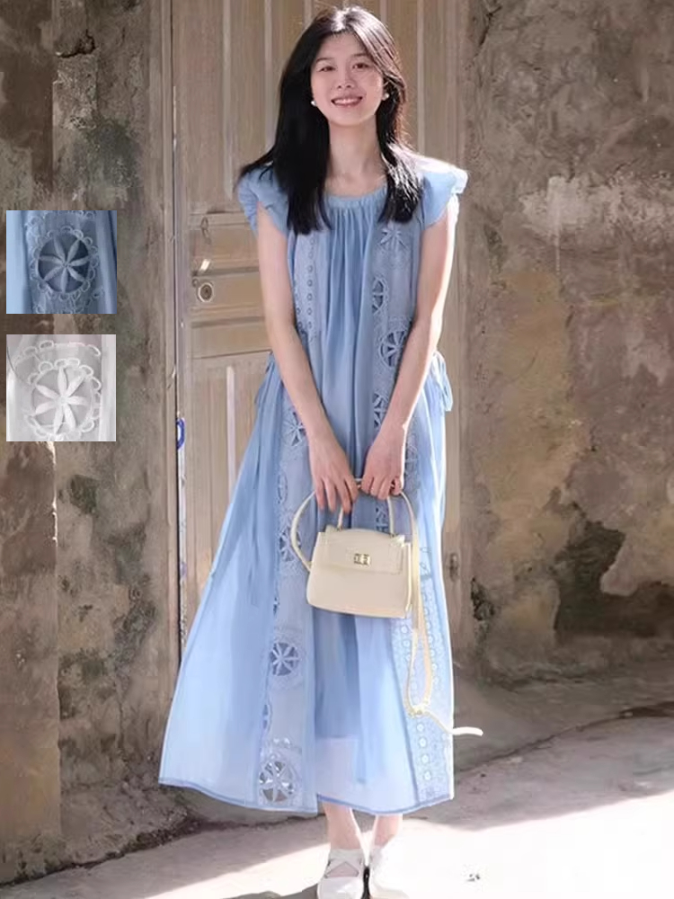 ワンピース レディース ロングワンピース ギャザー 刺繡 Aラインワンピース テントラインワンピース フレアスリーブ ギャザースリーブ ロング リゾート 大人 フレアワンピース 袖なし ノースリーブ