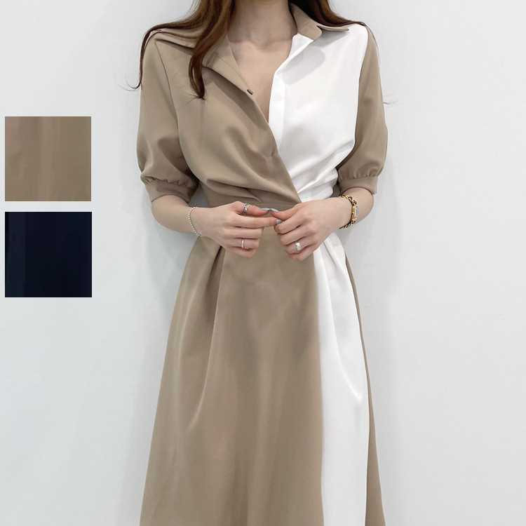 ワンピース シャツワンピース レディース ロングワンピース Aラインワンピース 半袖 切り替え バイカラー 春 夏