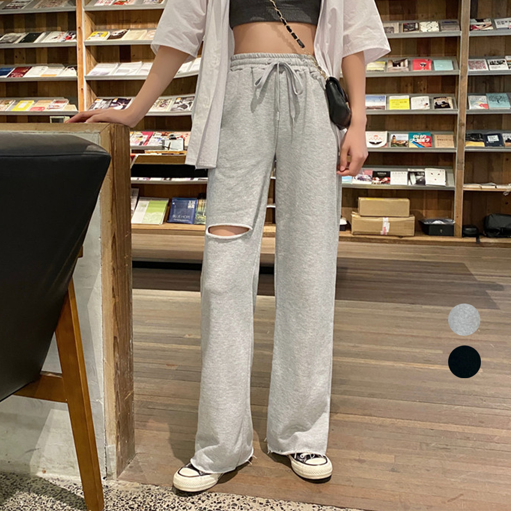 韓国 穴あき スエットロングパンツ ウエストゴム イージーパンツ カジュアル リラックス ストレートパンツ 着やせ