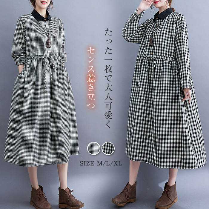 シャツワンピース チェック 丸襟ワンピース 秋冬 きれいめ ロング レディース 長袖 秋 冬 春 ロングワンピース 春秋 可愛い ゆったり 体型カバー チェックワンピース