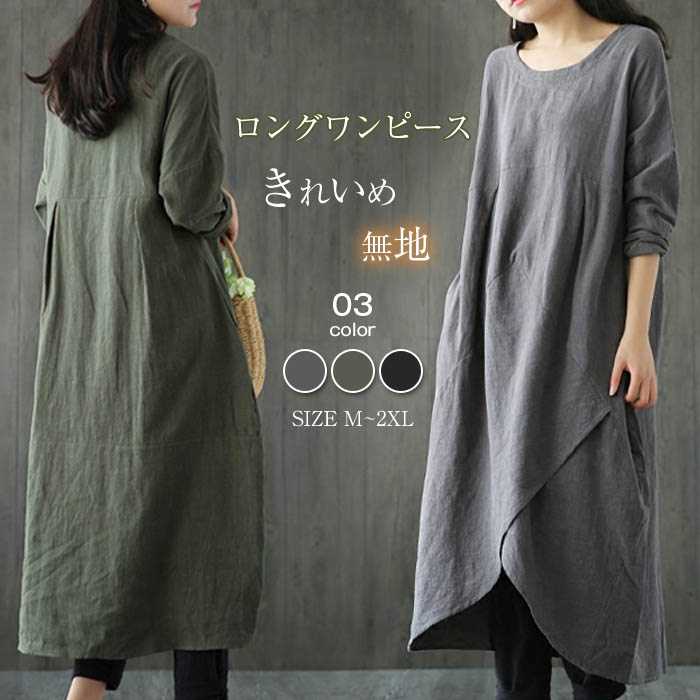 ワンピース 秋冬 きれいめ ロング 綿混 薄手 ゆったり ロングワンピース レディース 長袖 秋 冬 ワンピース 無地 ロングワンピ ポケット付き ラウンドネック