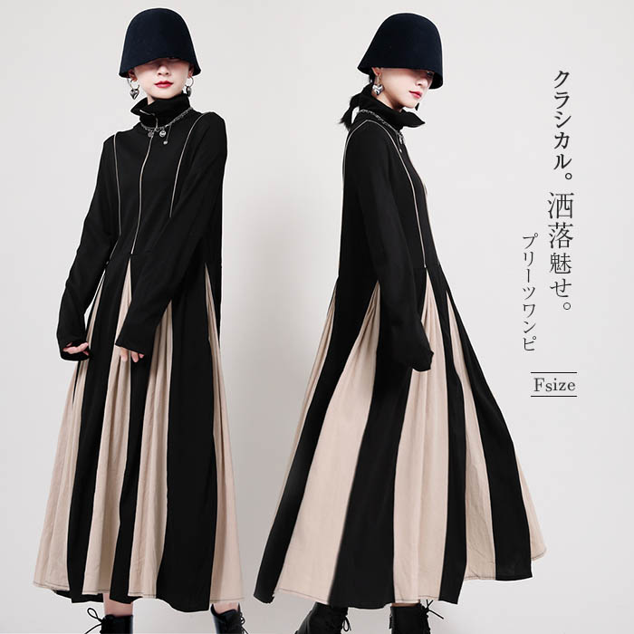 ワンピ―ス 長袖 ロング 切り替え フレア ワンピース ロングワンピース レディース Aライン ワンピース ハイネック モード ボトルネック タートルネック