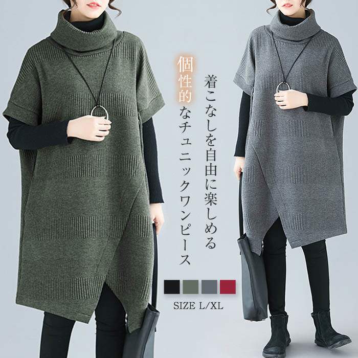 ワンピース レディース 秋 冬 チュニックワンピース チュニック ワンピース エスニック 重ね着 レイヤード 大人 上品 ひざ丈 アシンメトリー ハイネック タートルネック カジュアル