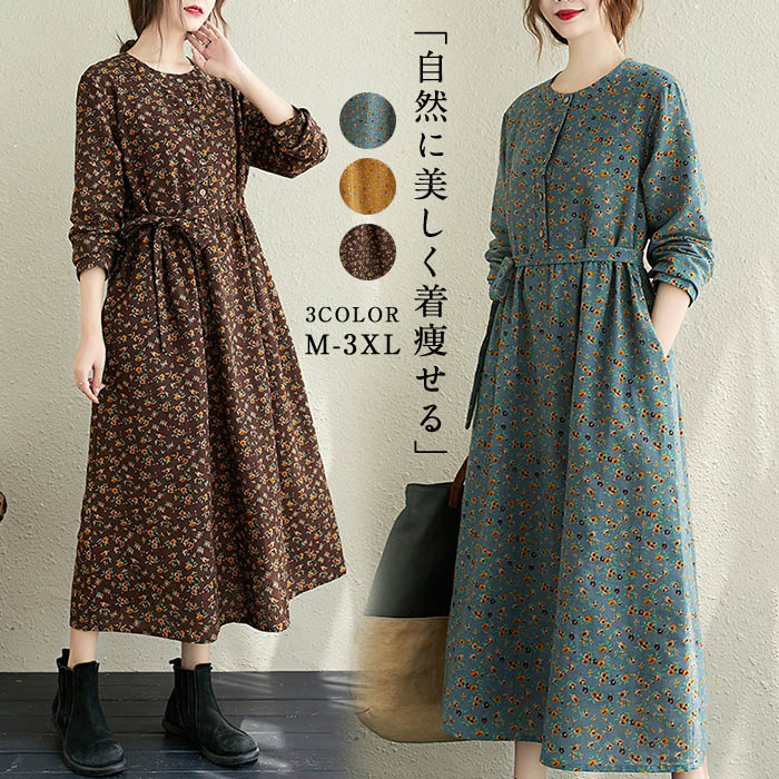 ワンピース レディース 長袖 きれいめ ロングワンピース ワンピ 花柄ワンピース リボン ロング丈 かわいい おしゃれ 大人可愛い カジュアル