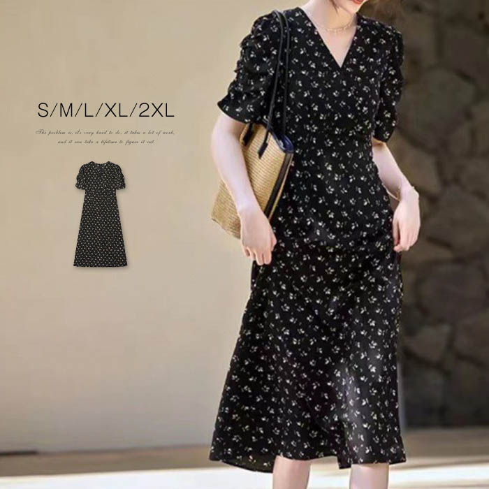 ワンピース 夏 レディース きれいめ ロング フレアワンピース 半袖 スリット 黒 おしゃれ ロングワンピース aライン 総柄 カジュアル 花柄 ゆったり