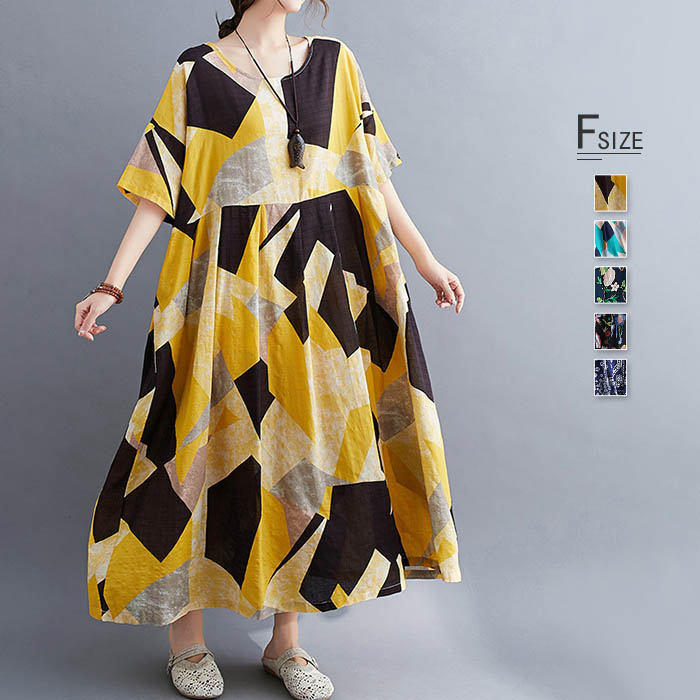 夏 ワンピース カジュアル 5分袖 レディース スリット 花柄 ロング 半袖 花柄ワンピース レトロ フレアワンピース ライン ワンピース 総柄