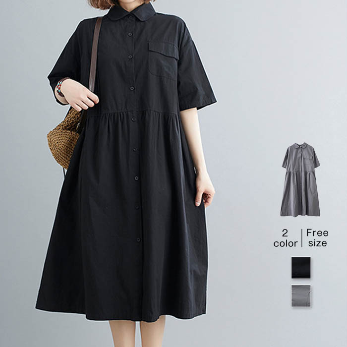 ワンピース レディース 夏 シャツワンピース 半袖 スタンドカラー ギャザー アシンメトリー ロングワンピース 羽織 シャツワンピ ロング丈 Aライン フレア