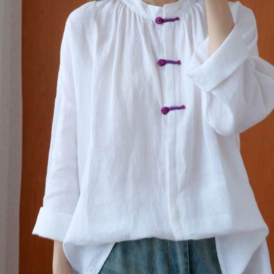 トップス シャツ 白シャツ ミディアム丈 袖付き 長袖 襟なし クルーネック 前開き ボタン かわいい 大人可愛い シンプル カジュアル 大人 上品 おしゃれ お洒落 かっこいい レトロ