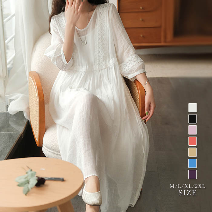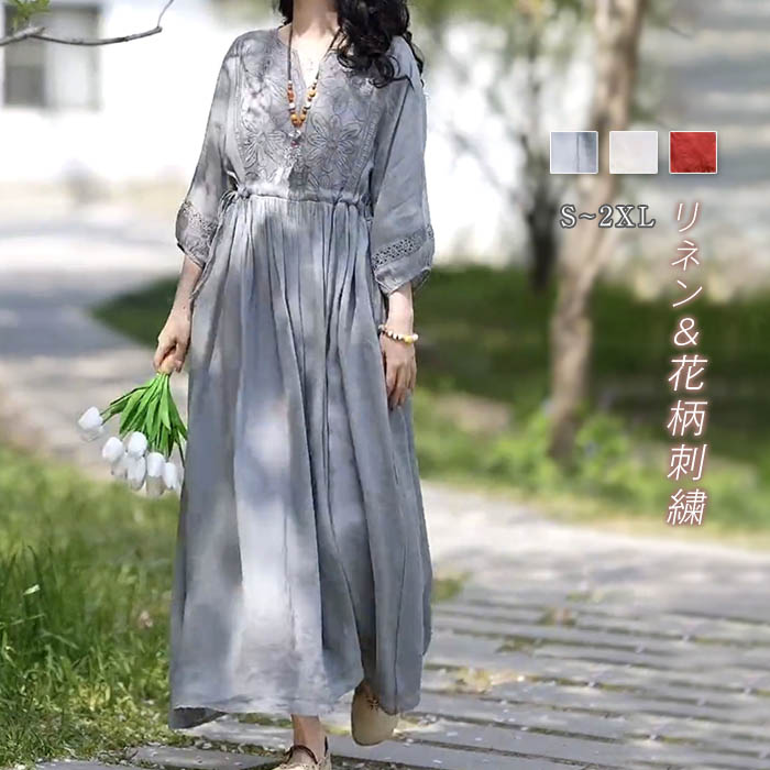 ワンピース レディース 夏 麻 七分袖 花柄 刺繍 リネン レース ロングワンピース ロング 7分袖 フレア 切り替え 春 フレアワンピース ラインワンピース エレガント パフ袖