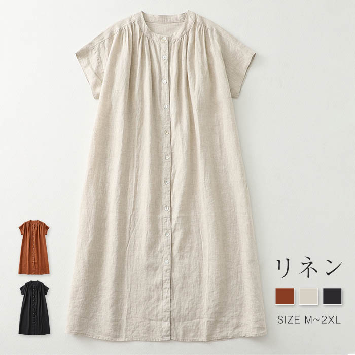 ワンピース レディース 夏 シャツワンピース 半袖 麻 リネン 羽織 バンドカラー シャツワンピ Aライン ギャザー 無地 ゆったり 体型カバー