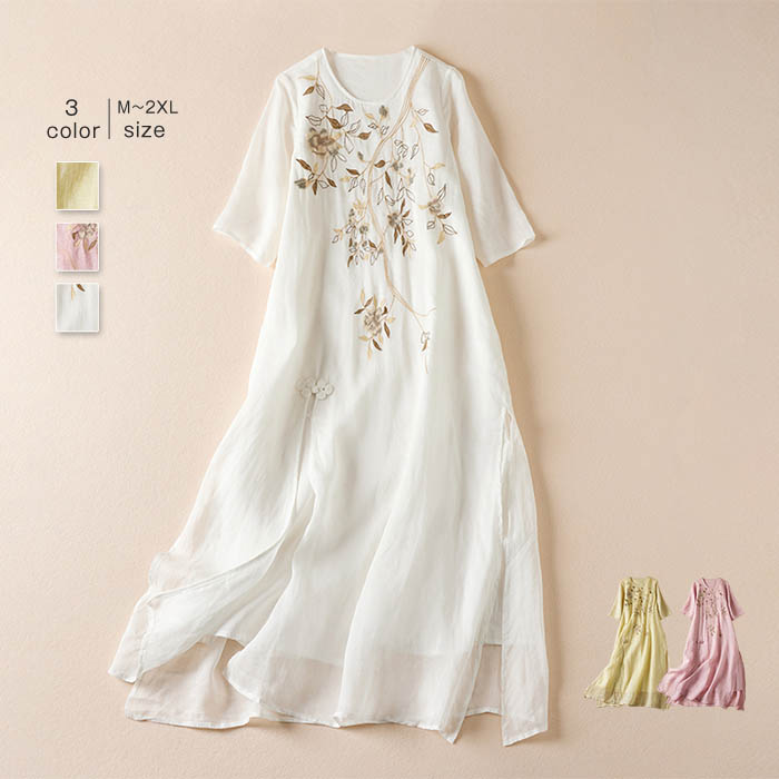 ワンピース レディース 夏 綿麻風 五分袖 半袖ワンピース 花柄 刺繍 スリット チャイナボタン リネン コットン 春 ラインワンピース