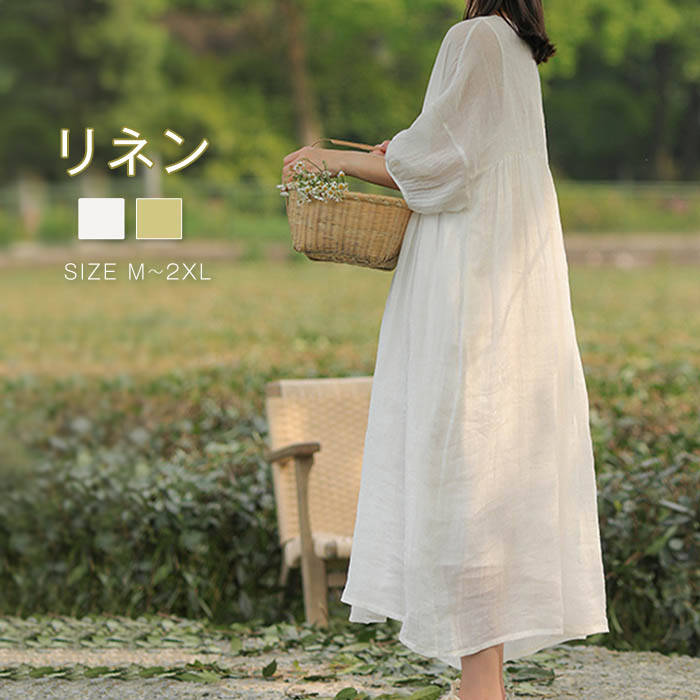 ワンピース レディース 夏 麻 5分袖 無地 リネン ロングワンピース ロング 半袖 フレア フレアワンピース Aラインワンピース エレガント パフ袖 パフスリーブ Aライン きれいめ