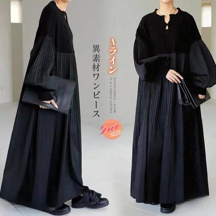 異素材 ワンピース ニット編み 春秋 レディース 春秋 ロングワンピース ロング丈 プリーツ aライン マキシ丈 マキシワンピース 切り替えワンピース