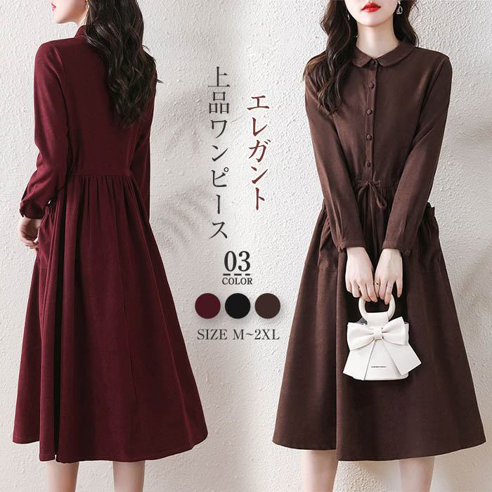 コーデュロイ ワンピース 春 秋冬 きれいめ 膝丈 折り襟 膝丈ワンピース 秋 長袖 レディース 春秋 無地 aライン ゆったり 大きいサイズ ギャザー ひざ下