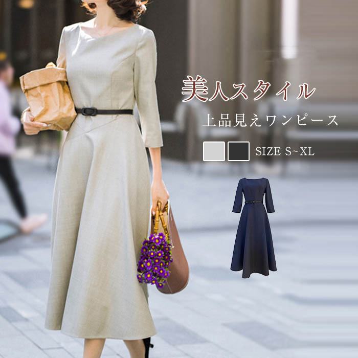 ワンピース ライン レディース 七分袖 無地 春秋 レディースワンピース レディースワンピ ロングワンピ 無地ワンピース フレアワンピース クルーネック ラインワンピース