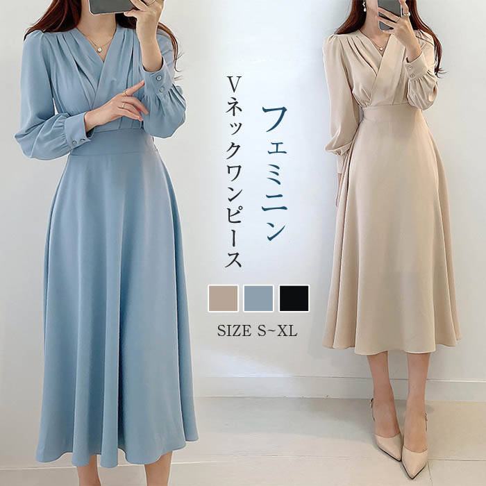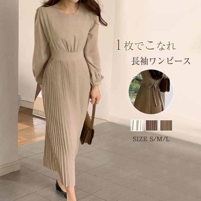 ワンピース レディース 長袖 春秋 ロングワンピース プリーツワンピース 長袖ワンピース 無地 プリーツ 春 秋 エレガント パフ袖 パフスリーブ Aライン サラサラ 日常