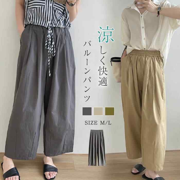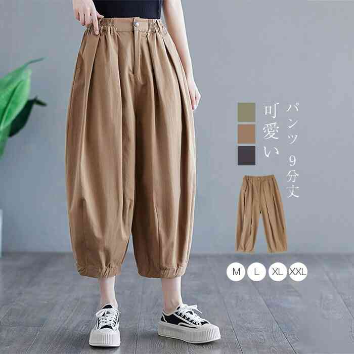 綿100% ワイドパンツ レディース きれいめ 春 大きいサイズ 9分丈 タックパンツ ギャザー ガウチョパンツ 可愛い 春 夏 ゆったり ウエストゴム ボトムス オーバーサイズ 通勤