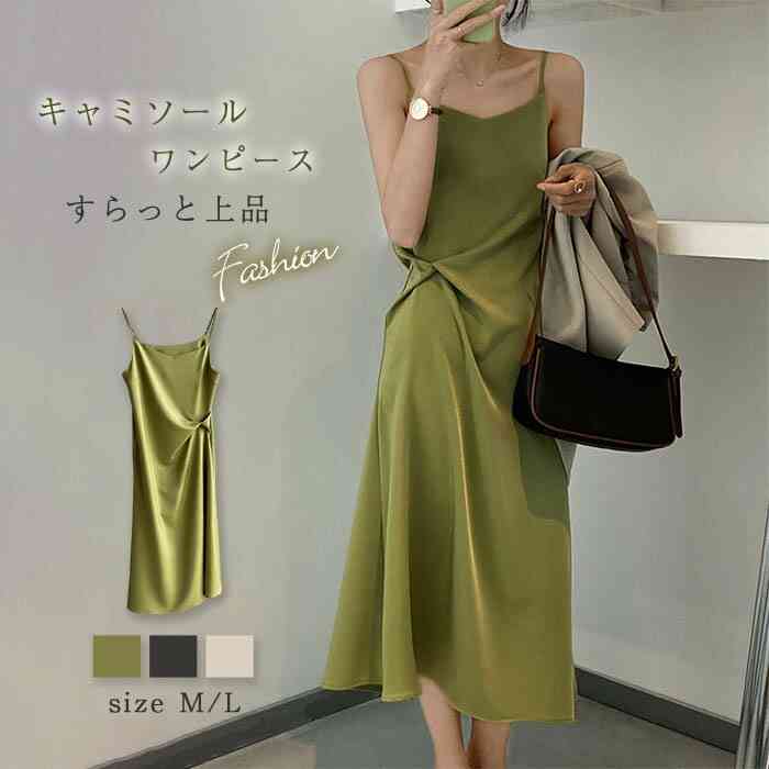 ワンピース 春 夏 きれいめ ロング キャミソールワンピース vネック サマー サテン キャミワンピース レディース キャミワンピ サテンワンピース aライン ワンピース