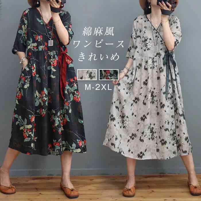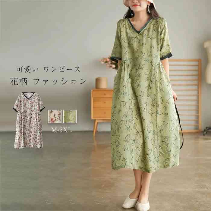 総柄 シャツワンピース ロング 春 夏 レディース 花柄 vネック ロングワンピース シャツ ワンピース 可愛い 綿麻調 ゆったり ワンピース 半袖 ロング丈 ワンピース ゆったり