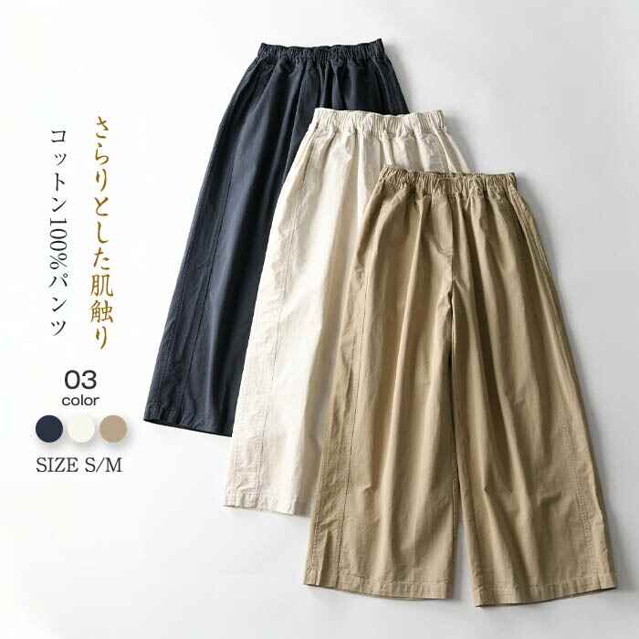 パンツ コットン 綿100% 美シルエット 上品 シンプル 快適 着心地良い 総ゴム カジュアル 森ガール リラックス 美脚 外出 着回し ナチュラル ゆったり ワイド 無地 20代 30代 40代