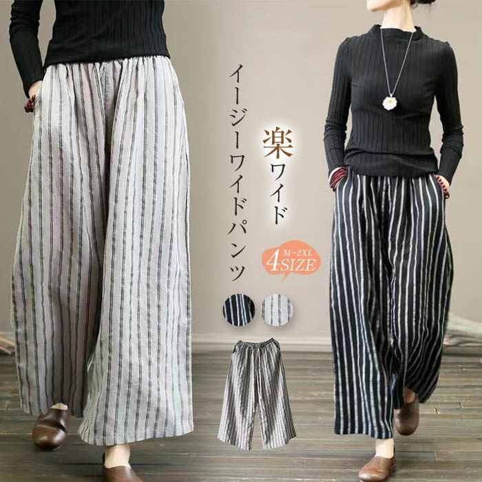 ワイドパンツ 夏 レディース コットン フレアパンツ 綿麻風 ガウチョパンツ ストライプ 春 夏 大きいサイズ ゆったり ボトムス ワイド 綿麻調 フレア カジュアル 20代 30代 40代 50代