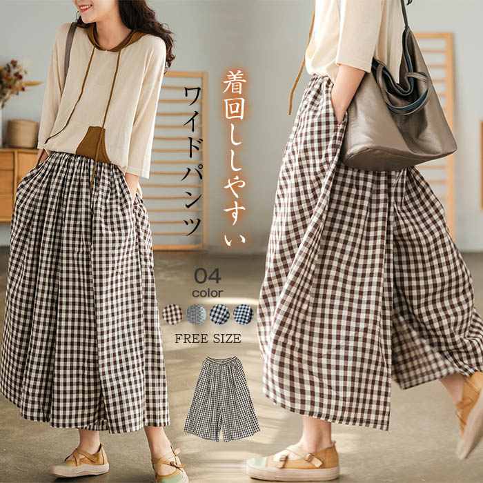 パンツ サーカスパンツ バルーンパンツ ワイドパンツ 春 夏 サルエルパンツ コクーンパンツ チェックパンツ ワイド ナチュラル 風合い ギャザー シンプル 夏 なつ 20代 30代 40代 50代
