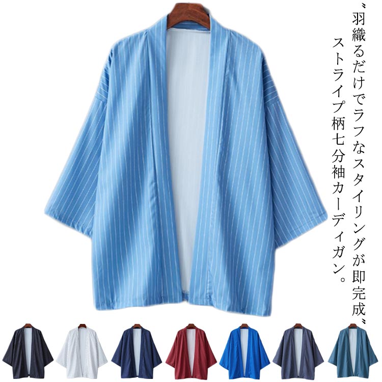 ボタンレス 春 カーディガン 半袖 羽織り ストライプ柄 甚平風 夏 薄手 7分袖 サマージャケット サマー