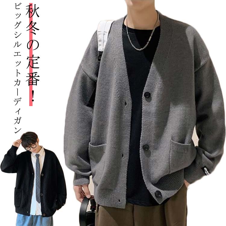 ニット カーディガン 無地 メンズ Vネック 軽量 ボタン ドロップショルダー ゆったり ライトアウター 羽織り